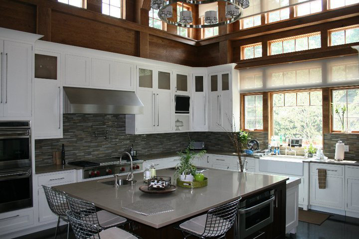 Visualize cabinet, countertop, floor tile and backsplash options in different kitchen settings